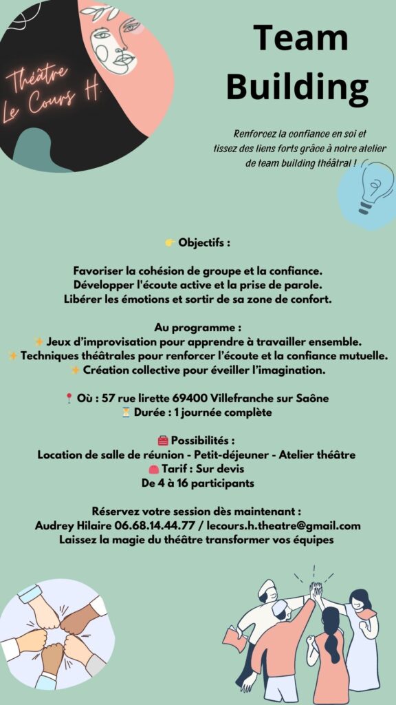 - 10h00-12h30 : Exercice d'échauffement, mise en pratique et balayage des thèmes de travail en fonction de votre date choisie (corps, contact, voix, respiration, espace, écoute, émotions...)
